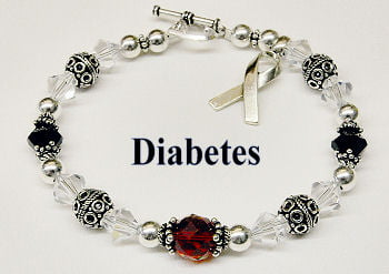 $10.00 from the sale of this bracelet is donated the Diabetes Research Foundation. This bracelet is made of Sterling Silver beads, bali beads and garnet red Swarovski crystals.