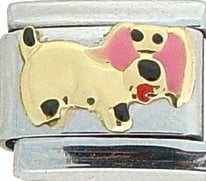It’s raining cats and dogs! This Dog with Pink Ears Italian charm is handcrafted of 18K gold, enamel and stainless steel and is compatible with all well known manufactures including Zoppini Firenze, Boxing, Uno Domani, Talexia, Carisma, Puzzle and Dolce Oro; and officially licensed charms from Casa D’Oro and ReFlorence which includes SpongeBob charms, Walt Disney charms, Charlie Brown and Snoopy charms and Scooby Doo charms. This is a medium size charm that fits all medium size bracelets.