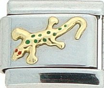 Animal Planet! This Gecko Italian charm is handcrafted of 18K gold, enamel and stainless steel and is compatible with all well known manufacturers including Zoppini Firenze, Boxing, UnoDomani, Talexia, Carisma, Puzzle and Dolce Oro; and officially licensed charms from Casa D’Oro and ReFlorence which includes SpongeBob charms, Walt Disney charms, Charlie Brown and Snoopy charms and Scooby Doo charms. Look for animal Italian charms from all over the world representing such countries as China, Australia and Africa. Look for our endangered species collection which includes the gray wolf, black and white panda, sea otter and gray seal Italian charms.. This is a medium size charm that fits all medium sized bracelets.