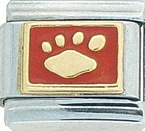 Animal Planet! This Gold Paw on Orange Italian charm is handcrafted of 18K gold, enamel and stainless steel and is compatible with all well known manufacturers including Zoppini Firenze, Boxing, UnoDomani, Talexia, Carisma, Puzzle and Dolce Oro; and officially licensed charms from Casa D’Oro and ReFlorence which includes SpongeBob charms, Walt Disney charms, Charlie Brown and Snoopy charms and Scooby Doo charms. Look for animal Italian charms from all over the world representing such countries as China, Australia and Africa. Look for our endangered species collection which includes the gray wolf, black and white panda, sea otter and gray seal Italian charms.. This is a medium size charm that fits all medium sized bracelets.
