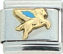 Animal Planet! This Pegasus Gold w/Blue Wings Italian charm is handcrafted of 18K gold, enamel and stainless steel and is compatible with all well known manufacturers including Zoppini Firenze, Boxing, UnoDomani, Talexia, Carisma, Puzzle and Dolce Oro; and officially licensed charms from Casa D’Oro and ReFlorence which includes SpongeBob charms, Walt Disney charms, Charlie Brown and Snoopy charms and Scooby Doo charms. Look for animal Italian charms from all over the world representing such countries as China, Australia and Africa. Look for our endangered species collection which includes the gray wolf, black and white panda, sea otter and gray seal Italian charms.. This is a medium size charm that fits all medium sized bracelets.