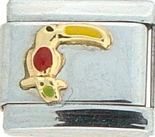 Animal Planet! This Tucan Red w/Yellow Italian charm is handcrafted of 18K gold, enamel and stainless steel and is compatible with all well known manufacturers including Zoppini Firenze, Boxing, UnoDomani, Talexia, Carisma, Puzzle and Dolce Oro; and officially licensed charms from Casa D’Oro and ReFlorence which includes SpongeBob charms, Walt Disney charms, Charlie Brown and Snoopy charms and Scooby Doo charms. Look for animal Italian charms from all over the world representing such countries as China, Australia and Africa. Look for our endangered species collection which includes the gray wolf, black and white panda, sea otter and gray seal Italian charms.. This is a medium size charm that fits all medium sized bracelets.