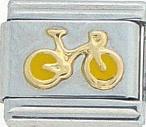 Sports Lovers! This Bicycle Yellow Italian charm is handcrafted of 18K gold, enamel and stainless steel and is compatible with such popular manufactures such as Zoppini Firenze, Boxing, UnoDomani, Talexia, Carisma and Puzzle, as well as licensed charms from Casa D'Oro and ReFlorence which includes SpongeBob, Walt Disney, Charlie Brown and Snoopy. This is a medium charm that fits the medium size Italian Charm Bracelet. Look for many more Italian sports charm in our sports section. We also have Pro Sport charms for baseball, hockey, football, basketball and college teams such as Boston Red Sox, New York Yankees, etc. that fit this Italian Composable bracelet.