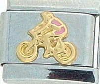 Sports Lovers! This Bicyclist Italian charm is handcrafted of 18K gold, enamel and stainless steel and is compatible with such popular manufactures such as Zoppini Firenze, Boxing, UnoDomani, Talexia, Carisma and Puzzle, as well as licensed charms from Casa D'Oro and ReFlorence which includes SpongeBob, Walt Disney, Charlie Brown and Snoopy. This is a medium charm that fits the medium size Italian Charm Bracelet. Look for many more Italian sports charm in our sports section. We also have Pro Sport charms for baseball, hockey, football, basketball and college teams such as Boston Red Sox, New York Yankees, etc. that fit this Italian Composable bracelet.
