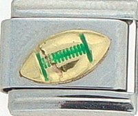 Sports Lovers! This Foootball w/Green Stitches Italian charm is handcrafted of 18K gold, enamel and stainless steel and is compatible with such popular manufactures such as Zoppini Firenze, Boxing, UnoDomani, Talexia, Carisma and Puzzle, as well as licensed charms from Casa D'Oro and ReFlorence which includes SpongeBob, Walt Disney, Charlie Brown and Snoopy. This is a medium charm that fits the medium size Italian Charm Bracelet. Look for many more Italian sports charm in our sports section. We also have Pro Sport charms for baseball, hockey, football, basketball and college teams such as Boston Red Sox, New York Yankees, etc. that fit this Italian Composable bracelet.