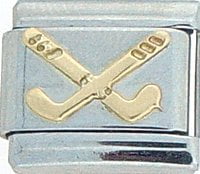 Sports Lovers! This Hockey Sticks Italian charm is handcrafted of 18K gold, enamel and stainless steel and is compatible with such popular manufactures such as Zoppini Firenze, Boxing, UnoDomani, Talexia, Carisma and Puzzle, as well as licensed charms from Casa D'Oro and ReFlorence which includes SpongeBob, Walt Disney, Charlie Brown and Snoopy. This is a medium charm that fits the medium size Italian Charm Bracelet. Look for many more Italian sports charm in our sports section. We also have Pro Sport charms for baseball, hockey, football, basketball and college teams such as Boston Red Sox, New York Yankees, etc. that fit this Italian Composable bracelet.