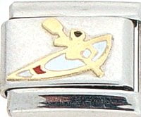 Sports Lovers! This Kayak Italian charm is handcrafted of 18K gold, enamel and stainless steel and is compatible with such popular manufactures such as Zoppini Firenze, Boxing, UnoDomani, Talexia, Carisma and Puzzle, as well as licensed charms from Casa D'Oro and ReFlorence which includes SpongeBob, Walt Disney, Charlie Brown and Snoopy. This is a medium charm that fits the medium size Italian Charm Bracelet. Look for many more Italian sports charm in our sports section. We also have Pro Sport charms for baseball, hockey, football, basketball and college teams such as Boston Red Sox, New York Yankees, etc. that fit this Italian Composable bracelet.