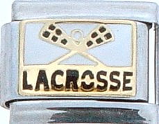 Sports Lovers! This Lacrosse Italian charm is handcrafted of 18K gold, enamel and stainless steel and is compatible with such popular manufactures such as Zoppini Firenze, Boxing, UnoDomani, Talexia, Carisma and Puzzle, as well as licensed charms from Casa D'Oro and ReFlorence which includes SpongeBob, Walt Disney, Charlie Brown and Snoopy. This is a medium charm that fits the medium size Italian Charm Bracelet. Look for many more Italian sports charm in our sports section. We also have Pro Sport charms for baseball, hockey, football, basketball and college teams such as Boston Red Sox, New York Yankees, etc. that fit this Italian Composable bracelet.