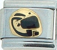 Sports Lovers! This Motorcycle Helmet Italian charm is handcrafted of 18K gold, enamel and stainless steel and is compatible with such popular manufactures such as Zoppini Firenze, Boxing, UnoDomani, Talexia, Carisma and Puzzle, as well as licensed charms from Casa D'Oro and ReFlorence which includes SpongeBob, Walt Disney, Charlie Brown and Snoopy. This is a medium charm that fits the medium size Italian Charm Bracelet. Look for many more Italian sports charm in our sports section. We also have Pro Sport charms for baseball, hockey, football, basketball and college teams such as Boston Red Sox, New York Yankees, etc. that fit this Italian Composable bracelet.