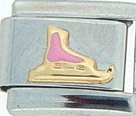 Sports Lovers! This Skate Boot Pink Italian charm is handcrafted of 18K gold, enamel and stainless steel and is compatible with such popular manufactures such as Zoppini Firenze, Boxing, UnoDomani, Talexia, Carisma and Puzzle, as well as licensed charms from Casa D'Oro and ReFlorence which includes SpongeBob, Walt Disney, Charlie Brown and Snoopy. This is a medium charm that fits the medium size Italian Charm Bracelet. Look for many more Italian sports charm in our sports section. We also have Pro Sport charms for baseball, hockey, football, basketball and college teams such as Boston Red Sox, New York Yankees, etc. that fit this Italian Composable bracelet.
