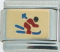Sports Lovers! This Skier with Blue Skis Italian charm is handcrafted of 18K gold, enamel and stainless steel and is compatible with such popular manufactures such as Zoppini Firenze, Boxing, UnoDomani, Talexia, Carisma and Puzzle, as well as licensed charms from Casa D'Oro and ReFlorence which includes SpongeBob, Walt Disney, Charlie Brown and Snoopy. This is a medium charm that fits the medium size Italian Charm Bracelet. Look for many more Italian sports charm in our sports section. We also have Pro Sport charms for baseball, hockey, football, basketball and college teams such as Boston Red Sox, New York Yankees, etc. that fit this Italian Composable bracelet.