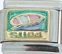 Sports Lovers! This Surf Board on Light Green Italian charm is handcrafted of 18K gold, enamel and stainless steel and is compatible with such popular manufactures such as Zoppini Firenze, Boxing, UnoDomani, Talexia, Carisma and Puzzle, as well as licensed charms from Casa D'Oro and ReFlorence which includes SpongeBob, Walt Disney, Charlie Brown and Snoopy. This is a medium charm that fits the medium size Italian Charm Bracelet. Look for many more Italian sports charm in our sports section. We also have Pro Sport charms for baseball, hockey, football, basketball and college teams such as Boston Red Sox, New York Yankees, etc. that fit this Italian Composable bracelet.