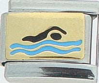 Sports Lovers! This Swimmer Italian charm is handcrafted of 18K gold, enamel and stainless steel and is compatible with such popular manufactures such as Zoppini Firenze, Boxing, UnoDomani, Talexia, Carisma and Puzzle, as well as licensed charms from Casa D'Oro and ReFlorence which includes SpongeBob, Walt Disney, Charlie Brown and Snoopy. This is a medium charm that fits the medium size Italian Charm Bracelet. Look for many more Italian sports charm in our sports section. We also have Pro Sport charms for baseball, hockey, football, basketball and college teams such as Boston Red Sox, New York Yankees, etc. that fit this Italian Composable bracelet.