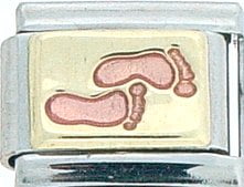This Feet Prints Pink in Gold Italian charm is handcrafted of 18K gold, enamel and stainless steel and is compatible with all well known manufacturers including Zoppini Firenze, Boxing, UnoDomani, Talexia, Carisma, Puzzle and Dolce Oro; and officially licensed charms from Casa D’Oro and ReFlorence which includes SpongeBob charms, Walt Disney charms, Charlie Brown and Snoopy charms and Scooby Doo charms.