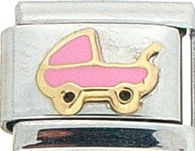 This Pink Baby Carriage Italian charm is handcrafted of 18K gold, enamel and stainless steel and is compatible with all well known manufacturers including Zoppini Firenze, Boxing, UnoDomani, Talexia, Carisma, Puzzle and Dolce Oro; and officially licensed charms from Casa D’Oro and ReFlorence which includes SpongeBob charms, Walt Disney charms, Charlie Brown and Snoopy charms and Scooby Doo charms.