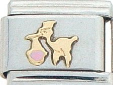 This Pink Stork Italian charm is handcrafted of 18K gold, enamel and stainless steel and is compatible with all well known manufacturers including Zoppini Firenze, Boxing, UnoDomani, Talexia, Carisma, Puzzle and Dolce Oro; and officially licensed charms from Casa D’Oro and ReFlorence which includes SpongeBob charms, Walt Disney charms, Charlie Brown and Snoopy charms and Scooby Doo charms.