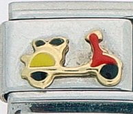 This Scooter Italian charm is handcrafted of 18K gold, enamel and stainless steel and is compatible with all well known manufacturers including Zoppini Firenze, Boxing, UnoDomani, Talexia, Carisma, Puzzle and Dolce Oro; and officially licensed charms from Casa D’Oro and ReFlorence which includes SpongeBob charms, Walt Disney charms, Charlie Brown and Snoopy charms and Scooby Doo charms.