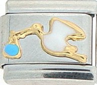 This Stork w/Blue Packet Italian charm is handcrafted of 18K gold, enamel and stainless steel and is compatible with all well known manufacturers including Zoppini Firenze, Boxing, UnoDomani, Talexia, Carisma, Puzzle and Dolce Oro; and officially licensed charms from Casa D’Oro and ReFlorence which includes SpongeBob charms, Walt Disney charms, Charlie Brown and Snoopy charms and Scooby Doo charms.