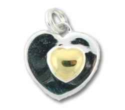 Two-tone silver heart-shaped bracelet charm.